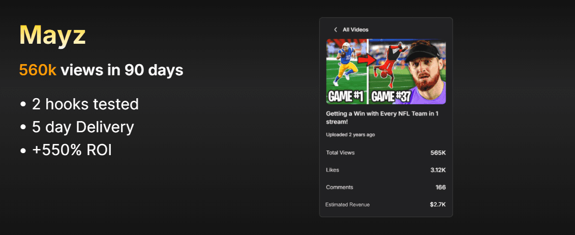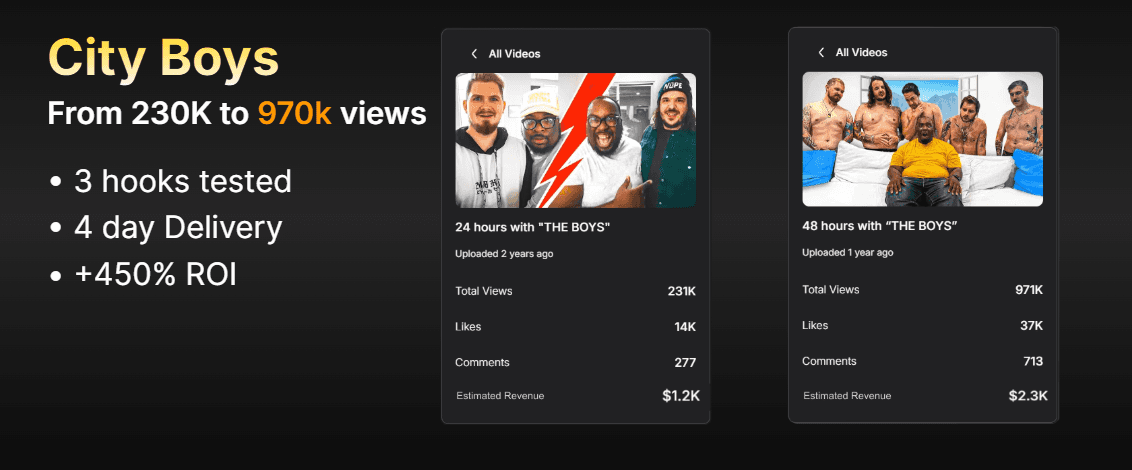 Amazing editing overall! Really takes time to storyboard videos and works with you on making the intros really pop! He also shows you rough cuts and gives you frequent updates!